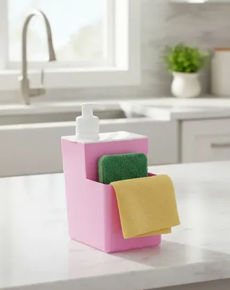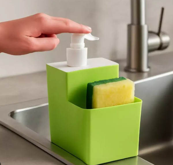 El dispensador de detergente con esponja para cocina es una solución práctica y eficiente. Combina un dispensador de detergente líquido con un compartimento para la esponja, manteniendo todo lo necesario para lavar platos al alcance.