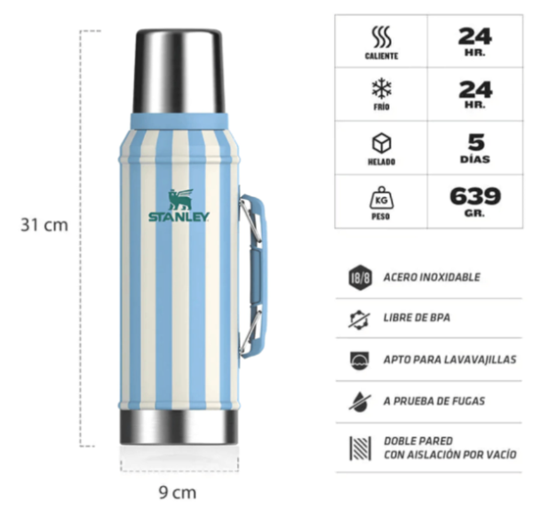 • El Termo Stanley Classic 950 ml 🧉 con manija tapón cebador es un producto icónico que ha acompañado a los aventureros al aire libre durante generaciones permitiéndoles disfrutar de bebidas calientes y frías mientras crean recuerdos inolvidables.