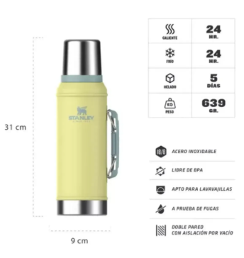 • El Termo Stanley Classic 950 ml 🧉 con manija tapón cebador es un producto icónico que ha acompañado a los aventureros al aire libre durante generaciones permitiéndoles disfrutar de bebidas calientes y frías mientras crean recuerdos inolvidables.