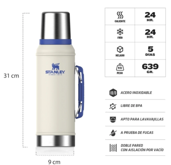 • El Termo Stanley Classic 950 ml 🧉 con manija y tapón cebador es un producto icónico que ha acompañado a los aventureros al aire libre durante generaciones permitiéndoles disfrutar de bebidas calientes y frías mientras crean recuerdos inolvidables.