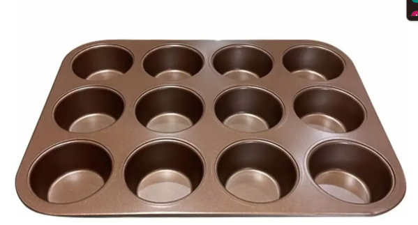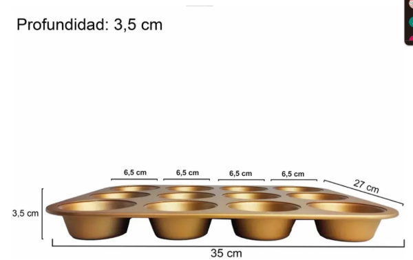 Fabricada en acero al carbono, este molde rectangular cuenta con 12 ranuras, permitiendo la preparación de múltiples cupcakes o muffins en una sola tanda.
